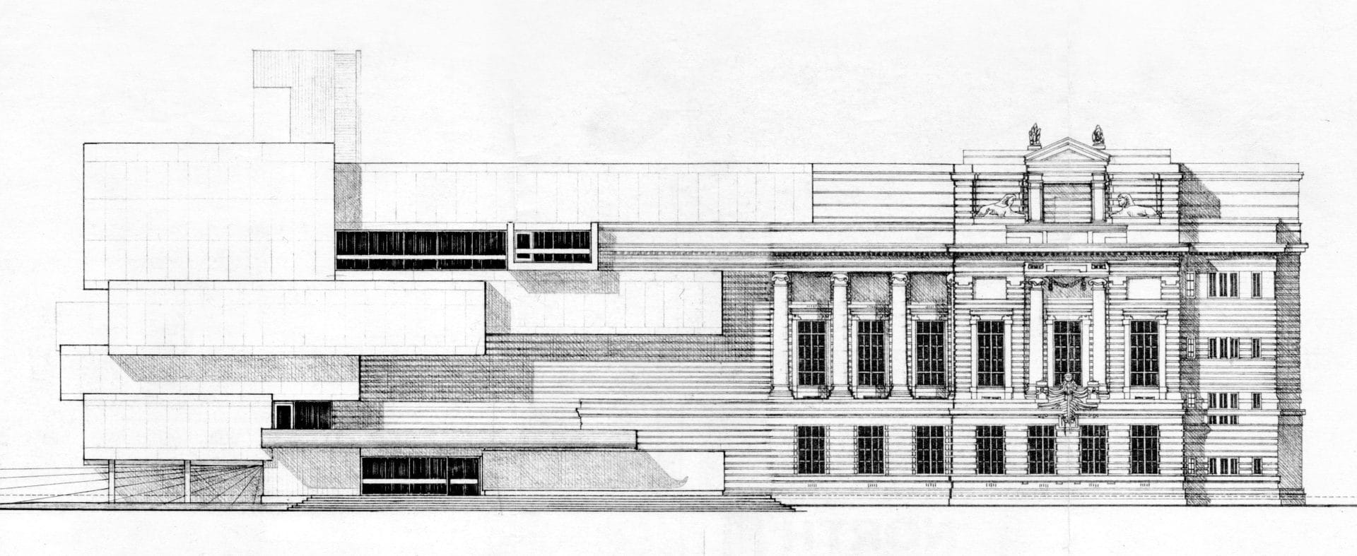 The design knitted the existing building and the proposed extension together, achieving the complete fusion of old and new in plan, section and elevation. The basic concept was an ascending spiral and this dictated both the internal layout and external massing. The overriding aesthetic was Brutalism, a provocative style of architecture, described by Reyner Banham in 1966 as “a violent revolutionary outburst.” The raw concrete of the new extension bore a striking contrast to the elaborate original Edwardian modelling. However, the finish of the concrete was carefully designed to harmonise in tone and colour with the existing building. And so, the ostensibly impossible synthesis of these two sharply divergent styles was achieved though brilliant design and careful attention to detail.